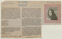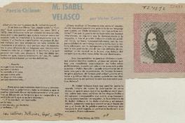 M. Isabel Velasco [artículo] / Víctor Castro. Las Últimas Noticias (Diario : Santiago, Chile)-- mar. 30, 1974, p. 8 (suplemento) retr. .