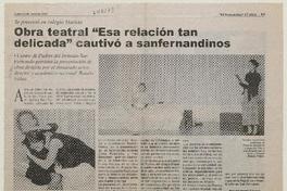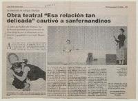 Obra teatral "esa relación tan delicada" cautivó a sanfernandinos [artículo] / Abelardo Caroca. El Rancagüino (Diario : Rancagua, Chile)-- jun. 30, 2003, p. 11. retr. .
