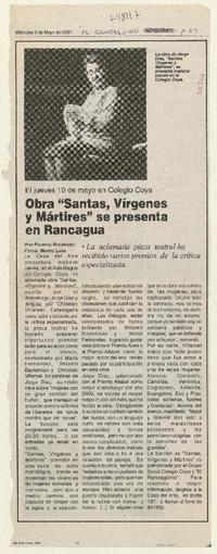 Obra "Santas, vírgenes y mártires" se presenta en Rancagua [artículo] / Patricio Rodríguez. El Rancagüino (Diario : Rancagua, Chile)-- mayo 9, 2001, p. 23. retr. .