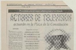 Actores de televisión actuarán en la Plaza de la Cosntitución. [artículo] El Nortino (Diario : Iquique, Chile)-- nov. 10, 2001, p. 24. retr. .