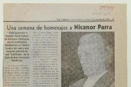 Una semana de homenajes a Nicanor Parra. [artículo] La Tribuna (Diario : Los Angeles, Chile)-- ago. 9, 2001, p. 23. retr. .