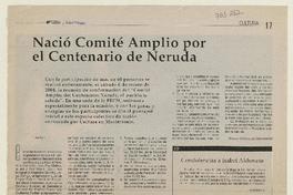 Nació comité amplio por el Centenario de Neruda [artículo] / José Osorio. El Siglo (Diario : Santiago, Chile)-- mar. 12, 2004, p. 17. .