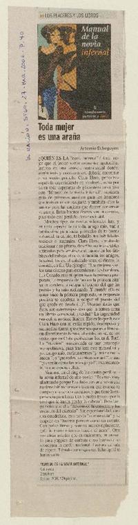Toda mujer es una araña [artículo]/ Aremio Echegoyen. La Nación (Diario: Santiago, Chile) mar. 27, 2006, p. 40 .