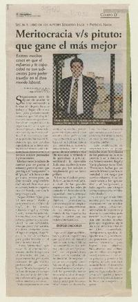 Meritocracia v/s pituto: que gane el más mejor [artículo]/ Richard Velásquez Guerrero. El Llanquihue (Diario : Puerto Montt, Chile)-- mayo 27, 2007, p. D13 .