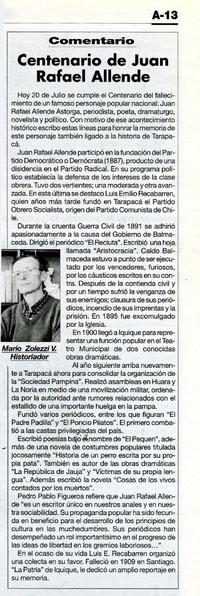 Centenario de Juan Rafael Allende [artículo] / Mario Zolezzi V. La Estrella (Diario : Iquique, Chile)-- jul. 20, 2009, p. A13. .