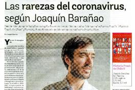 Las rarezas del coronavirus, según Joaquín Barañao [artículo]. El Llanquihue (Diario : Puerto Montt, Chile)-- Jun. 7, 2020, p. 1, (Suplemento "Ku"). El Austral (Diario : Temuco, Chile)-- jun. 7, 2020, p. 1, (Suplemento "KU"). .