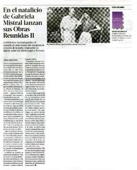 En el natalicio de Gabriela Mistral lanzan sus "Obras Reunidas II" [artículo] / Andrés Goméz Bravo. La Tercera (Diario : Santiago, Chile)-- abr. 7, 2020, p. 21. .
