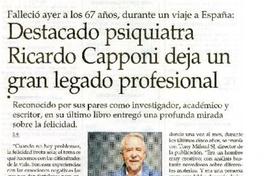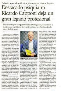 Destacado psiquiatra Ricardo Capponi deja un gran legado profesional [artículo] / C. G. El Mercurio (Diario : Santiago, Chile)-- ene. 14, 2020, p. C7. .