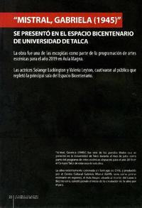"Mistral, Gabriela (1945)" se presentó en el espacio bicentenario de Universidad de Talca. [artículo] De Colección (Revista : Talca, Chile)-- año 5, no. 8, (2019), p. 22 a 25. .