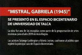"Mistral, Gabriela (1945)" se presentó en el espacio bicentenario de Universidad de Talca. [artículo]
