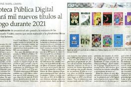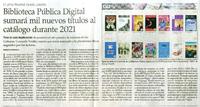Biblioteca Pública Digital sumará mil nuevos títulos al catálogo durante 2021 [artículo] / Roberto Careaga C. El Mercurio (Diario : Santiago, Chile)-- ene. 30, 2021, p. A8. .