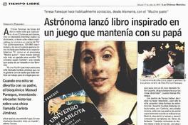 Astrónoma lanzó libro inspirado en un juego que mantenía con su papá [artículo] / Fernando Marambio. Las Últimas Noticias (Diario : Santiago, Chile)-- jul. 17, 2021, p. 24. .