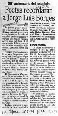 Poetas recordarán a Jorge Luis Borges. [artículo] La Época (Diario : Santiago, Chile)-- ago. 18, 1997, página 22. 1 página. .