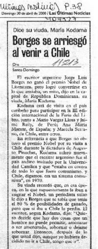 Borges se arriesgó al venir a Chile [artículo] / DPA. Las Últimas Noticias (Diario : Santiago, Chile)-- abr. 30, 2000, página 38. 1 página. .