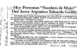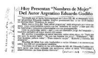 Hoy presentan "Nombres de mujer" del autor argentino Eduardo Gudiño. [artículo] El Mercurio (Diario : Santiago, Chile)-- mayo 14, 1988, p. C13. .