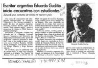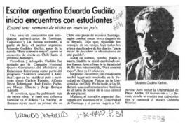 Escritor argentino Eduardo Gudiño inicia encuentros con estudiantes [artículo] Las Últimas Noticias (Diario : Santiago, Chile)-- sept. 1, 1992, p. 31. .