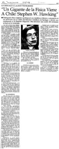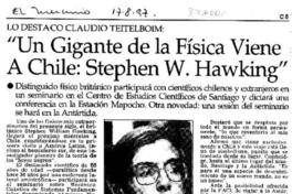 Un Gigante de la física viene a Chile, Stephen W. Hawking. [artículo] El Mercurio (Diario : Santiago, Chile)-- ago. 17, 1997, p. C5. .
