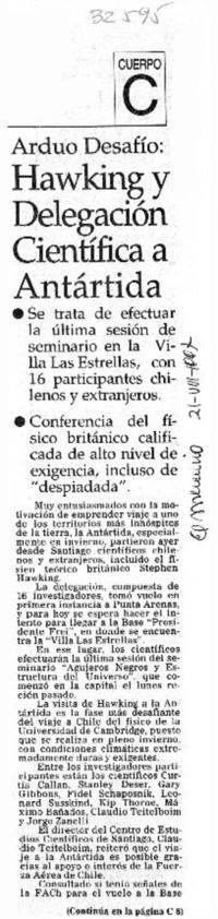 Hawking y Delegación Científica a Antártida. [artículo] El Mercurio (Diario : Santiago, Chile)-- ago. 21, 1997, p. C1 y C6. .