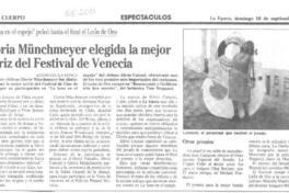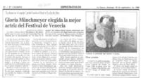 Gloria Munchmeyer elegida la mejor actriz del Festival de Venecia "La luna en el espejo" peleó hasta el final el León de Oro [artículo] / La Época (Diario : Santiago, Chile)-- sep. 16, 1990, p. 12. .