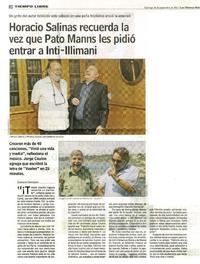 Horacio Salinas recuerda la vez que Pato Manns les pidió entrar a Inti-Illimani [artículo] / Carolina Saavedra. Las Últimas Noticias (Diario : Santiago, Chile)-- sept. 26, 2021, p. 24. .