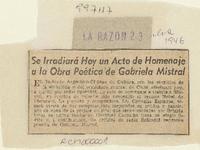 Se irradiará hoy un acto de homenaje a la obra poética de Gabriela Mistral. [artículo]