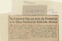 Se irradiará hoy un acto de homenaje a la obra poética de Gabriela Mistral. [artículo] La Razón (Diario : Argentina)-- ene. 23, 1946, s/p. .