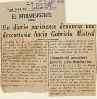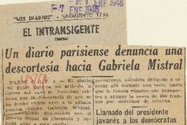Un Diario parisiense denuncia una descortesía hacia Gabriela Mistral [artículo]. El Intransigente (Diario : Salta, Argentina)-- ene. 7, 1946, s/n. .