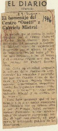 El homenaje del centro "Onetti" a Gabriela Mistral [artículo]. El Diario (Diario : Paraná, Argentina)-- ene. 29, 1946, s/n. .
