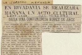 En Rivadavia se realizará mañana un acto cultural. dará una conferencia Nuñez de Arce. [artículo] La Libertad (Diario : Mendoza, Argentina) -- nov. 2, 1948, p. s/n. .