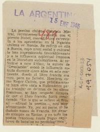 La Poetisa chilena Gabriela Mistral [artículo]. La Argentina (Diario)-- ene. 15, 1946, s/n. .