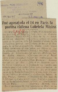 Fue agasajada el 14 en Paris la poetisa chilena Gabriela Mistral. [artículo]