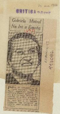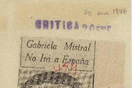 Gabriela Mistral no irá a España. [artículo] Crítica-- ene. 20, 1946, s/n. .