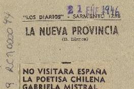 No visitará España la poetisa chilena Gabriela Mistral. [artículo] La Nueva Provincia (Diario : Bahía Blanca, Argentina)-- ene. 21, 1946, s/n. .