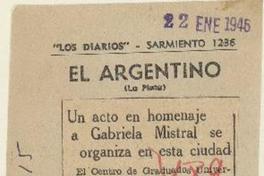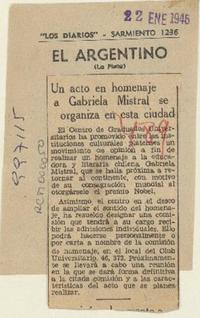 Un Acto en homenaje a Gabriela Mistral se organiza en esta ciudad [artículo]. El Argentino (Diario : La Plata, Argentina)-- ene. 22, 1946, s/n. .