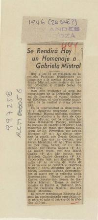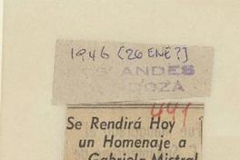 Se rendirá hoy un homenaje a Gabriela Mistral. [artículo] Los Andes (Diario: Mendoza, Argentina)-- ene. 26, 1946, s/n. .