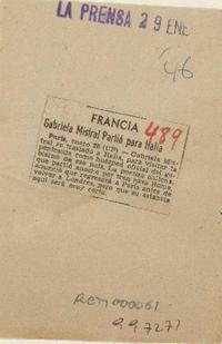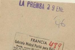 Gabriela Mistral partió para Italia. [artículo] La Prensa (Diario : Buenos Aires, Argentina)-- ene. 29, 1946, s/n. .