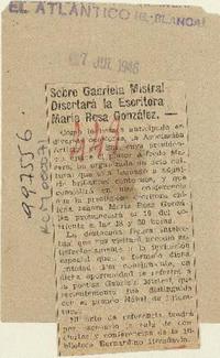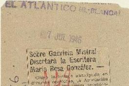 Sobre Gabriela Mistral disertará la escritora María Rosa González. [artículo] El Atlántico (Diario : Bahía Blanca, Argentina)-- jul. 27, 1946, s/n. .