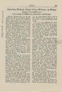 Gabriela Mistral, Nobel Prize-Winner, at home [artículo] / Arturo Torres-Rioseco. El Taquígrafo Gregg (Revista)-- jul. 1946, p. 805-806. .