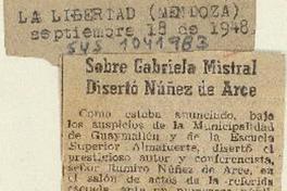 Sobre Gabriela Mistral disertó Nuñez de Arce. [artículo] La Libertad (Diario : Mendoza, Argentina)-- sep. 18, 1948, s/n. .