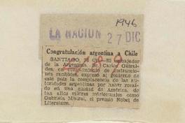 Congratulación Argentina a Chile. [artículo] La Nación (Diario : Argentina)-- dic. 27, 1946, s/n. .
