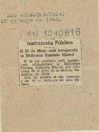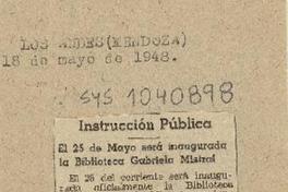 Instrucción pública el 25 de mayo será inagurada la Biblioteca Gabriela Mistral / [artículo] : Los Andes (Diario : Mendoza, Argentina)-- may. 18, 1948, s/n. .