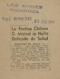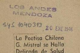 La poetisa chilena G. Mistral se haya delicada de salud [artículo]. Los Andes (Diario : Mendoza, Argentina)-- ene. 20, 1948, s/n. .