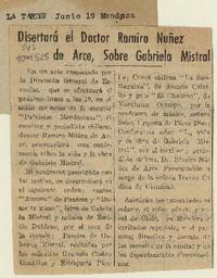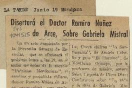 Disertará el doctor Ramiro Nuñez de Arce, sobre Gabriela Mistral. [artículo] La Tarde (Diario : Mendoza, Argentina)-- jun. 19, 1948, s/n. .
