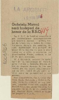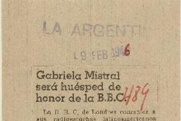 Gabriela Mistral será huésped de honor de la B.B.C. [artículo]. La Argentina (Diario)-- feb. 19, 1946, s/n. .