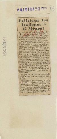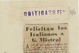 Felicitan los italianos a G. Mistral. [artículo] Crítica (Diario : Buenos Aires, Argentina)-- feb. 28, 1946, p. s/n. .