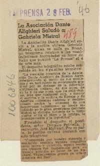 La Asociación Dante Alighieri saludó a Gabriela Mistral [artículo]. La Prensa (Diario : Buenos Aires, Argentina)-- feb. 28, 1946, s/n. .