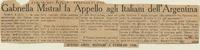 Gabriella Mistral fa appello agli italiani dell' Argentina. [artículo]