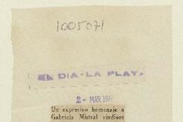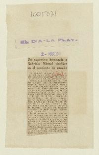 Un Expresivo homenaje a Gabriela Mistral rindióse en el concierto de anoche [artículo]. El Día (Diario : La Plata, Argentina)-- mar. 2, 1946, p. s/n. .