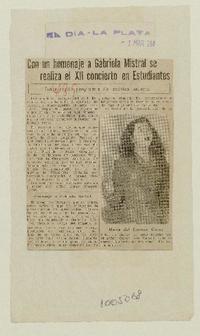 Con un homenaje a Gabriela Mistral se realiza el XII concierto en estudiantes. [artículo] El Día (Diario : La Plata, Argentina)-- mar. 1, 1946, p. s/n. .
