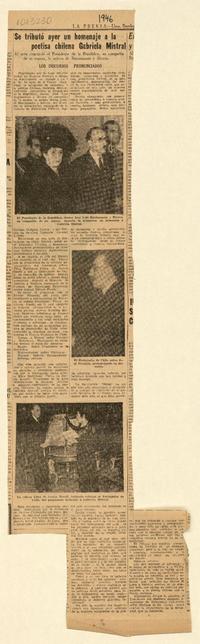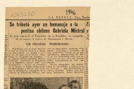 Se tributó ayer un homenaje a la poetisa chilena Gabriela Mistral. [artículo] La Prensa (Diario : Lima, Perú)-- jun. 23, 1946, p. s/n. .